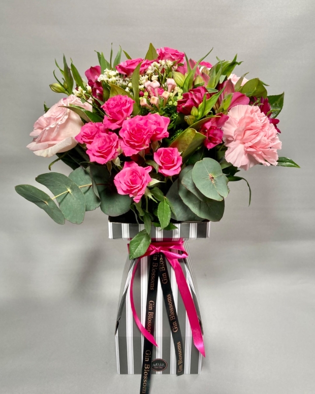 A selection of fresh, seasonal flowers and foliages in varying pink tones arranged as a hand-tied bouquet and presented in water in a floralbox.
