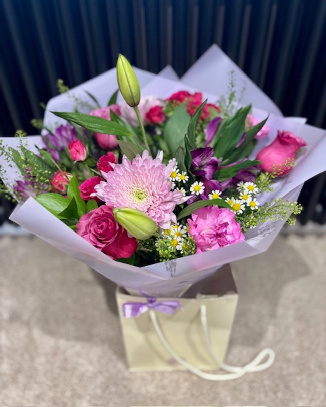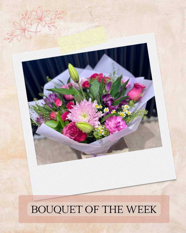 This weeks bouquet of the week is a lovely mix of pinks and purples. Filled with the most beautiful chrysant blooms, alstromeria, roses and a stunning double headed lily, these fresh flowers will really brighten up the room.